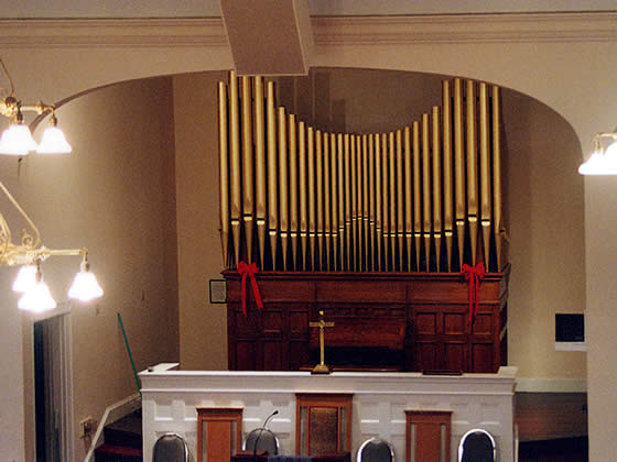 The organ is free-standing and encased at the front of the sanctuary in a